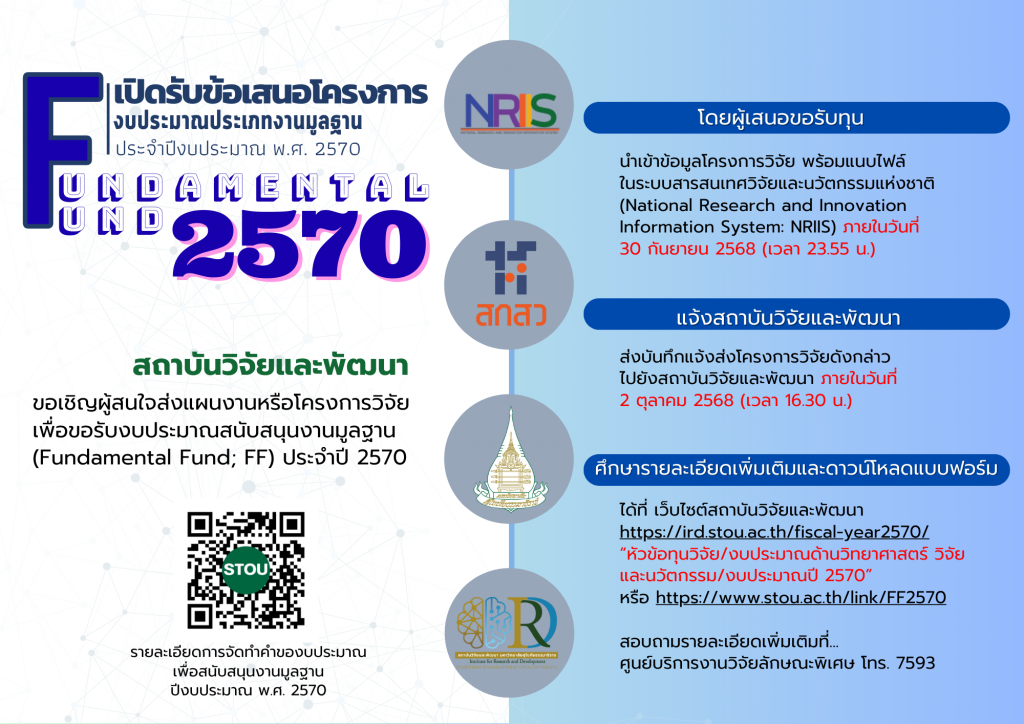 - ประกาศมหาวิทยาลัยสุโขทัยธรรมาธิราช เรื่อง กรเปิดรับสมัครแผนงานวิจัยและพัฒนานวัตกรรมเพื่อขอรับงบประมาณสนับสนุนงานมูลฐาน (Fundamental Fund; FF) ประจำปีงบประมาณ พ.ศ. 2570 (NEW)